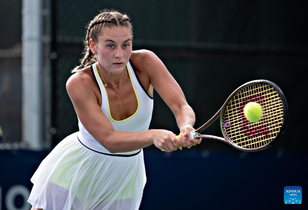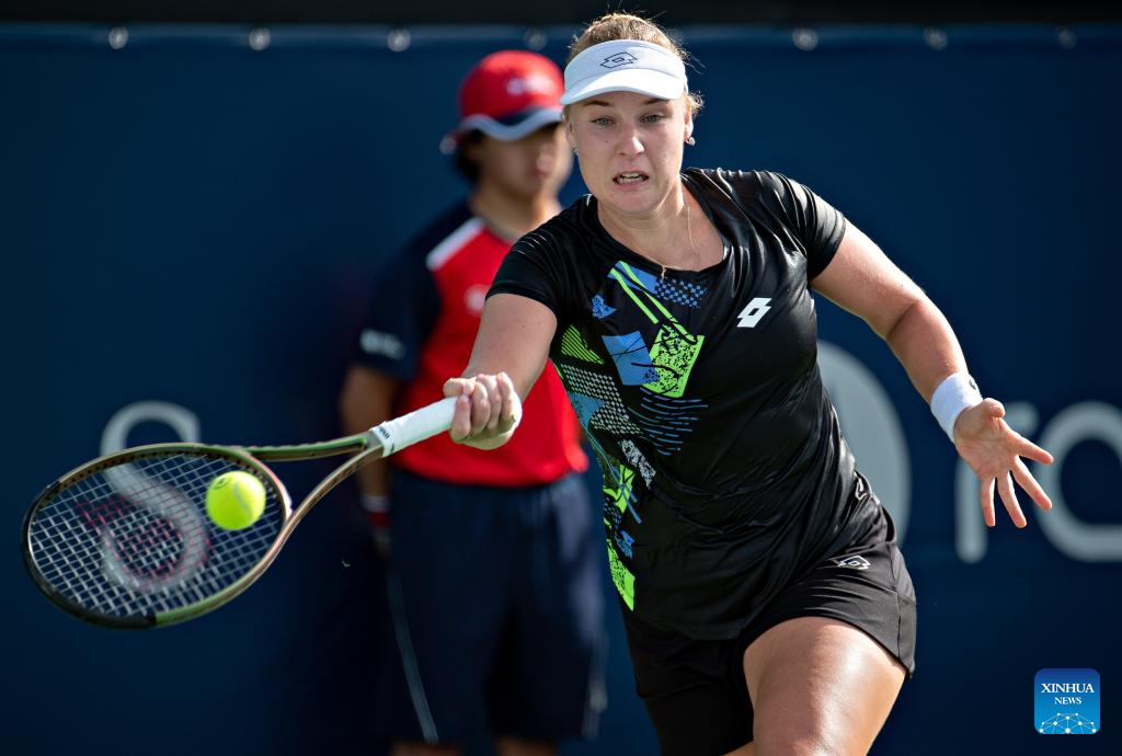 Marta Kostyuk of Ukraine returns the ball during a women's singles first round match against Zheng Qinwen of China at the 2023 National Bank Open in Montreal, Canada, Aug. 8, 2023. (Photo by Andrew Soong/Xinhua)