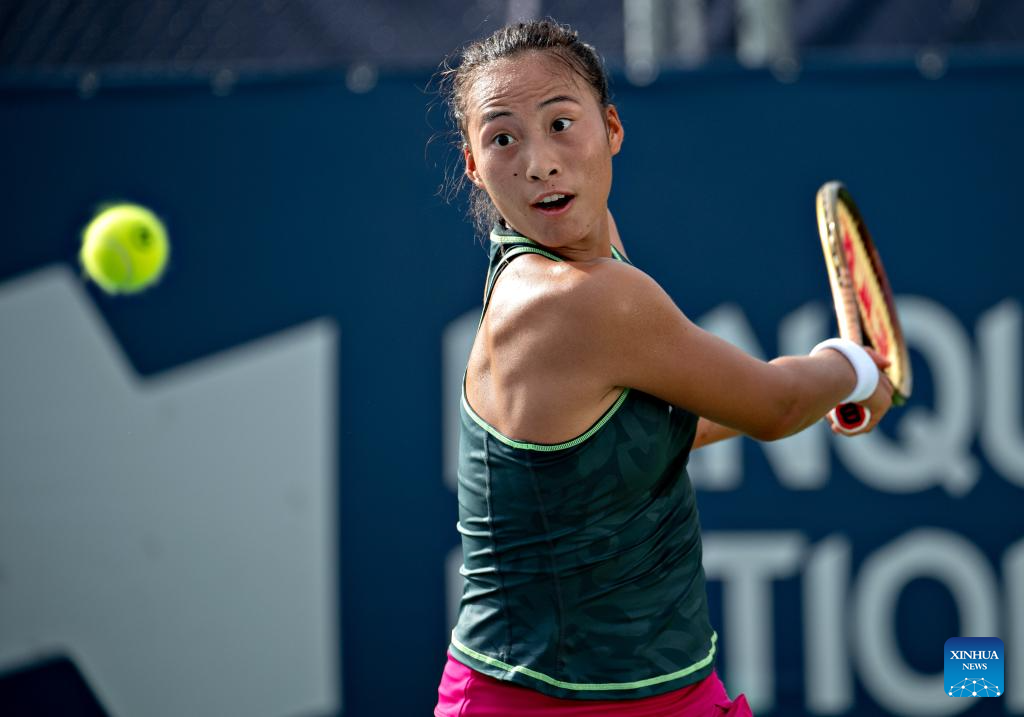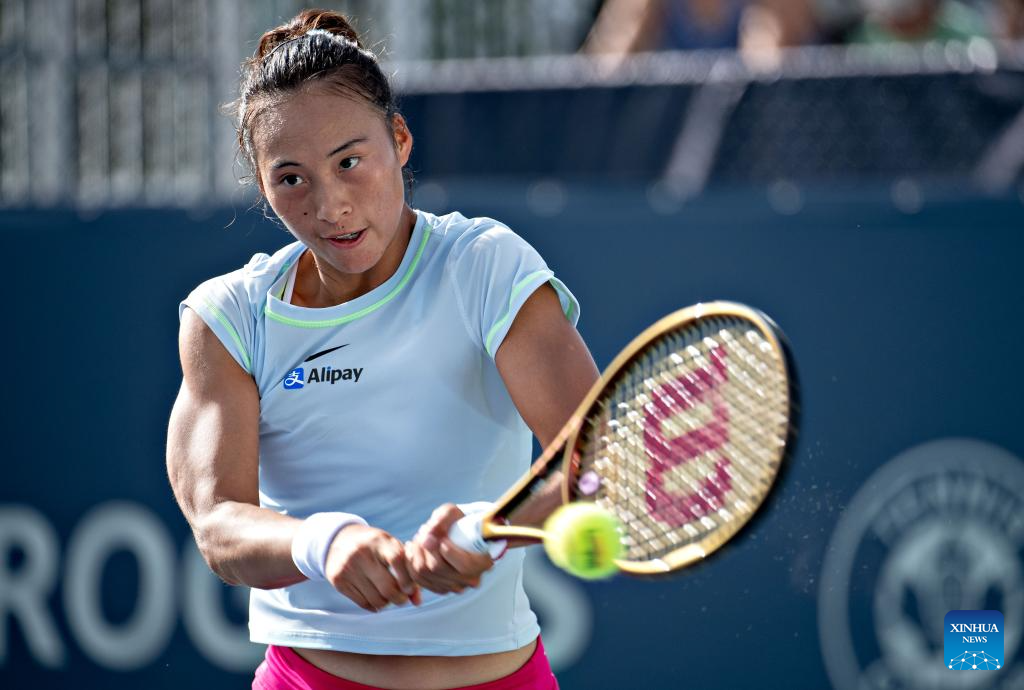 Zheng Qinwen of China returns the ball during a women's singles first round match against Marta Kostyuk of Ukraine at the 2023 National Bank Open in Montreal, Canada, Aug. 8, 2023. (Photo by Andrew Soong/Xinhua)