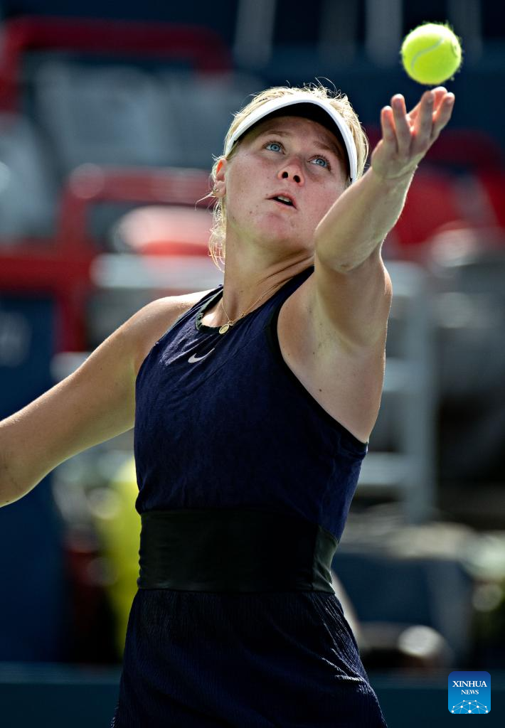 Peyton Stearns of the United States serves during the women's singles first round match against Leylah Fernandez of Canada at the 2023 National Bank Open in Montreal, Canada, Aug. 8, 2023. (Photo by Andrew Soong/Xinhua)