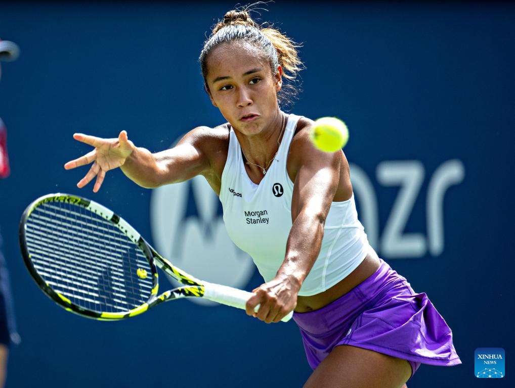 Leylah Fernandez of Canada returns the ball during the women's singles first round match against Peyton Stearns of the United States at the 2023 National Bank Open in Montreal, Canada, Aug. 8, 2023. (Photo by Andrew Soong/Xinhua)