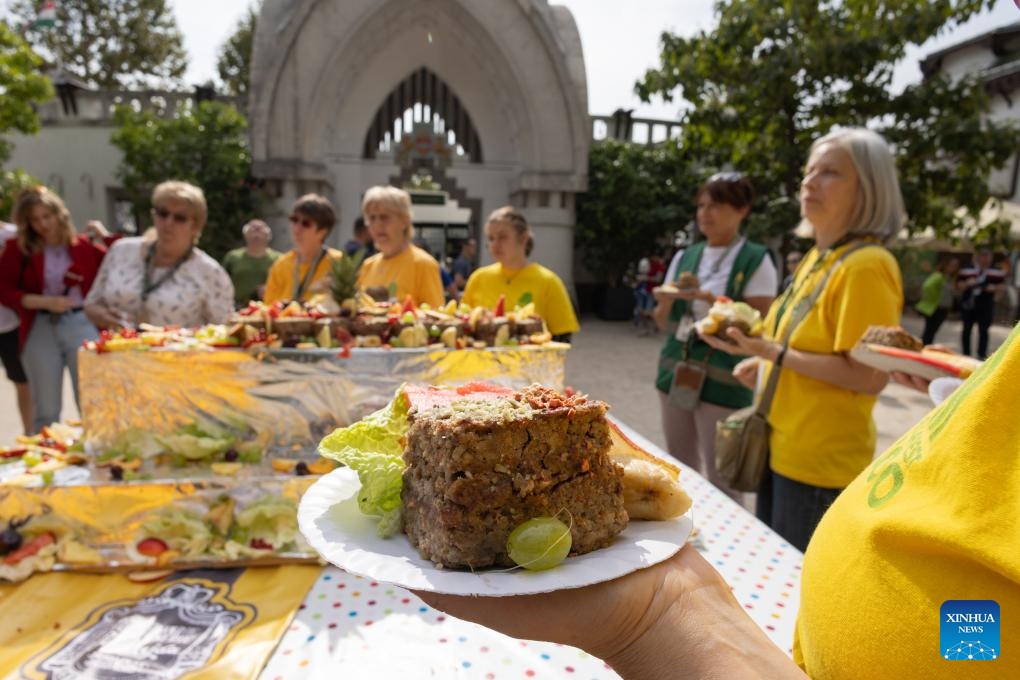 People taste a special cake edible for both humans and animals at Budapest Zoo in Budapest, Hungary, Aug. 9, 2023. Budapest Zoo celebrated its 157th anniversary on Wednesday. (Photo by Attila Volgyi/Xinhua)