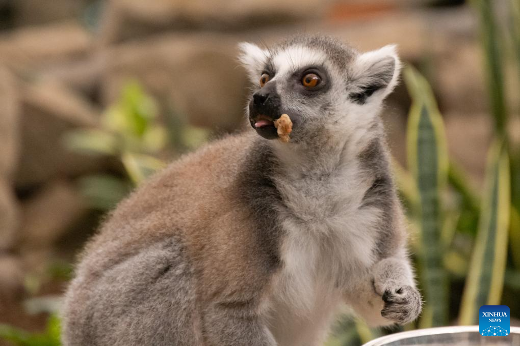 A ring-tailed lemur tastes a piece of special cake edible for both humans and animals at Budapest Zoo in Budapest, Hungary, Aug. 9, 2023. Budapest Zoo celebrated its 157th anniversary on Wednesday. (Photo by Attila Volgyi/Xinhua)