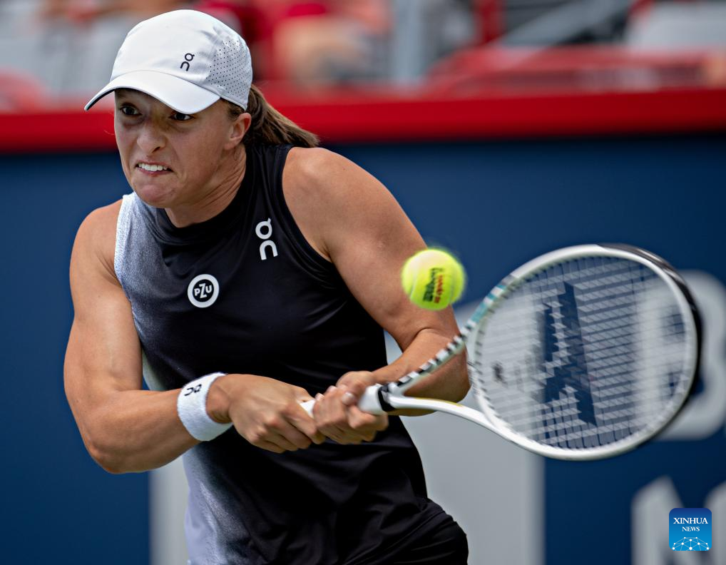 Iga Swiatek of Poland hits a return during the women's singles round of 16 match between Karolina Muchova of the Czech Republic and Iga Swiatek of Poland at the National Bank Open tennis tournament in Montreal, Canada, on Aug. 10, 2023. (Photo by Andrew Soong/Xinhua)