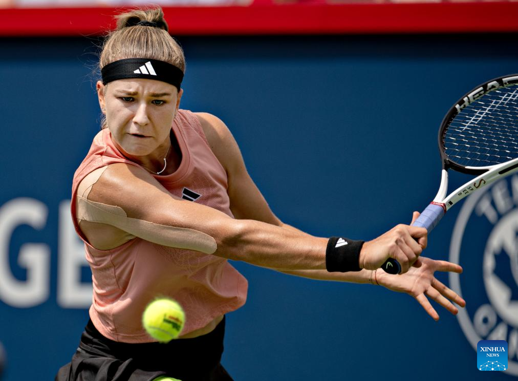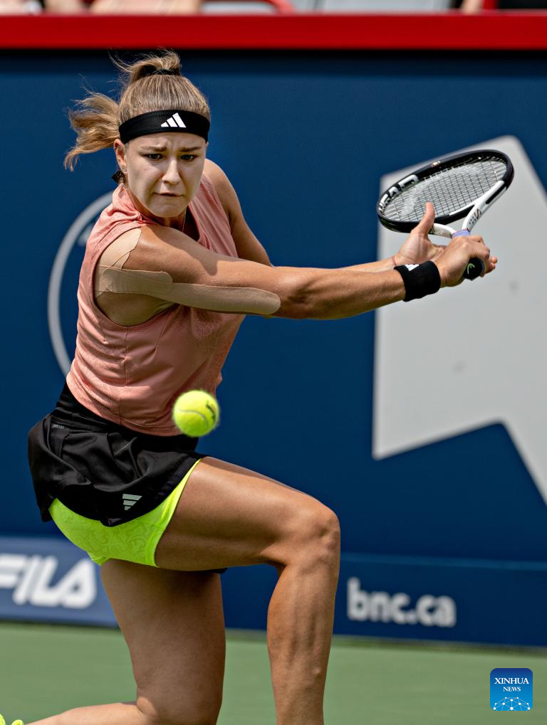 Karolina Muchova of the Czech Republic hits a return during the women's singles round of 16 match between Karolina Muchova of the Czech Republic and Iga Swiatek of Poland at the National Bank Open tennis tournament in Montreal, Canada, on Aug. 10, 2023. (Photo by Andrew Soong/Xinhua)