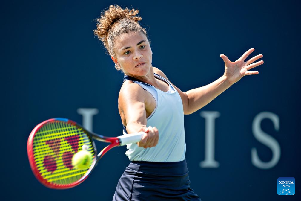 Jasmine Paolini of Italy hits a return during the women's singles round of 16 match between Jessica Pegula of the United States and Jasmine Paolini of Italy at the National Bank Open tennis tournament in Montreal, Canada, on Aug. 10, 2023. (Photo by Andrew Soong/Xinhua)