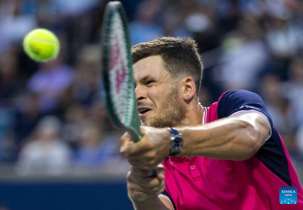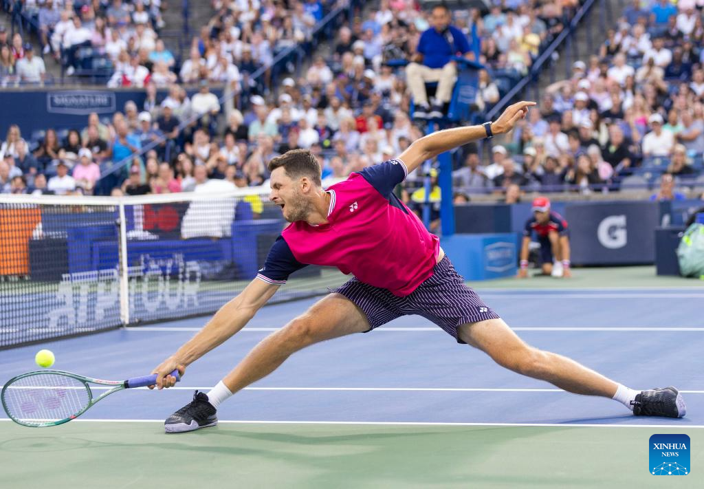 Hubert Hurkacz competes during the men's singles round of 16 match between Carlos Alcaraz of Spain and Hubert Hurkacz of Poland at the National Bank Open tennis tournament in Toronto, Canada, on Aug. 10, 2023. (Photo by Zou Zheng/Xinhua)