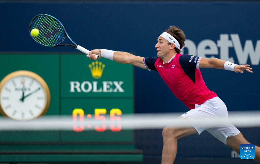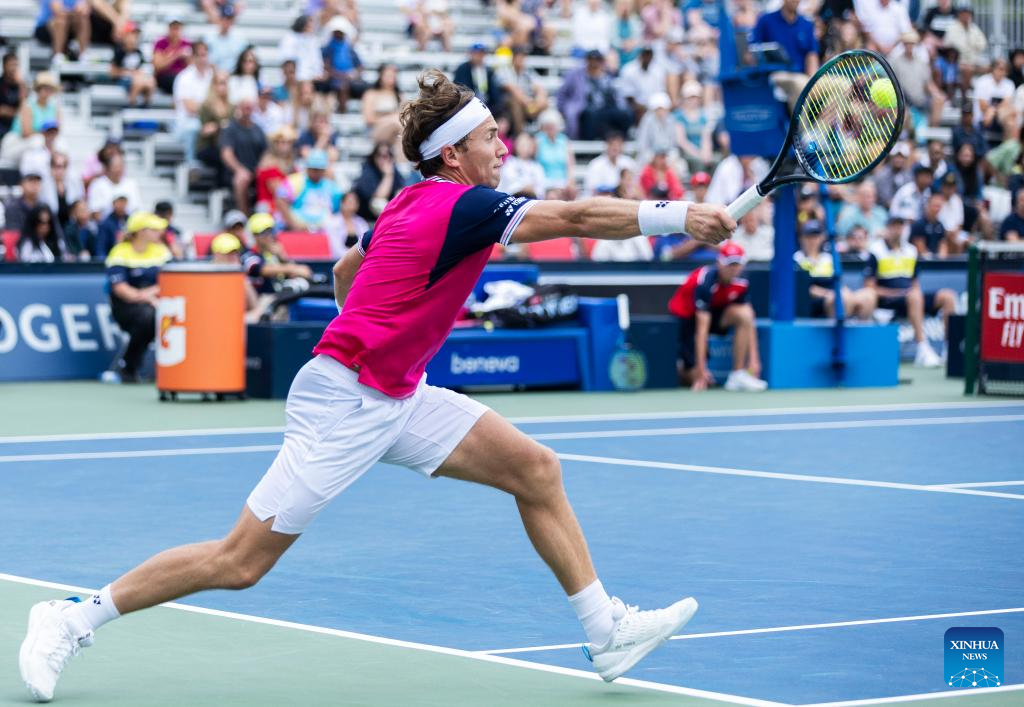 Casper Ruud competes during the men's singles round of 16 match between Alejandro Davidovich Fokina of Spain and Casper Ruud of Norway at the National Bank Open tennis tournament in Toronto, Canada, on Aug. 10, 2023. (Photo by Zou Zheng/Xinhua)