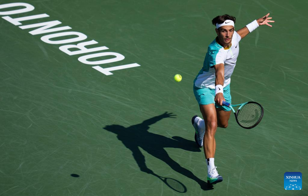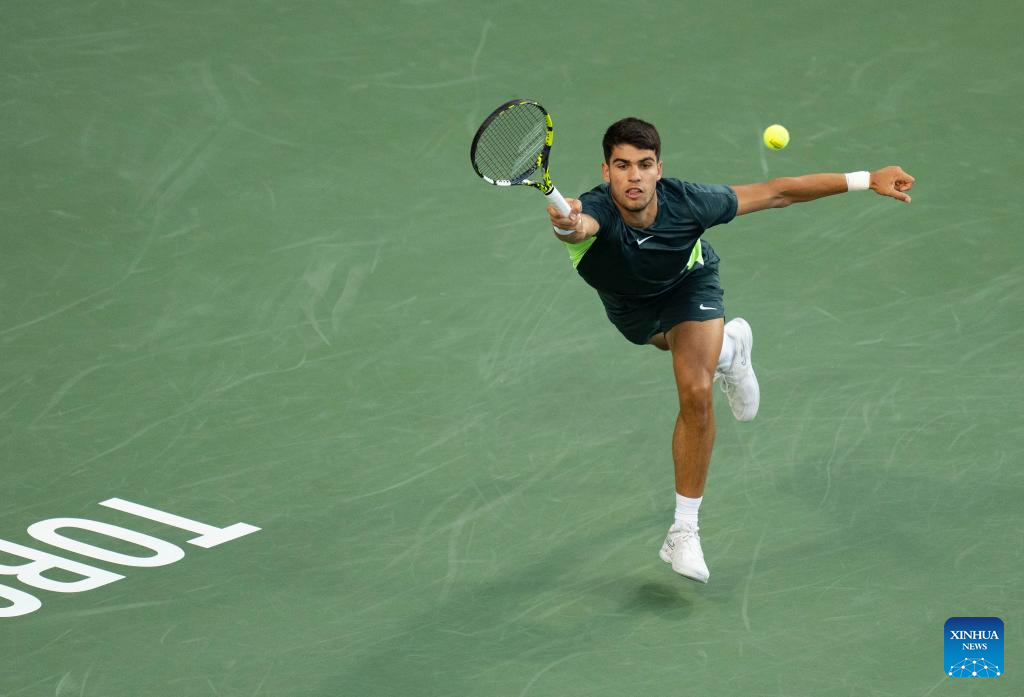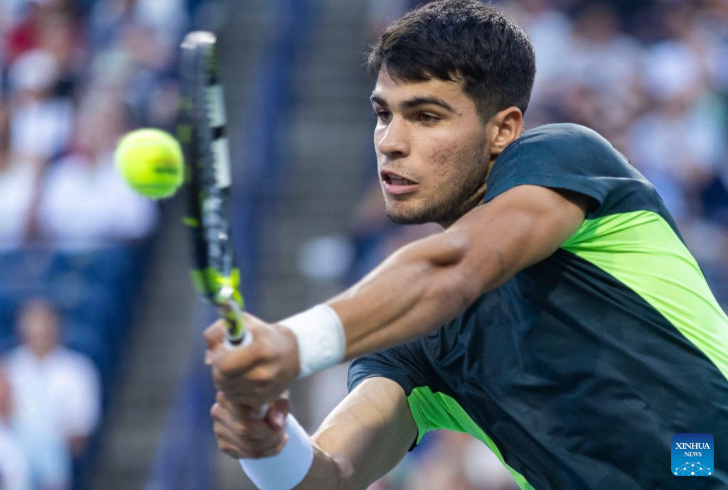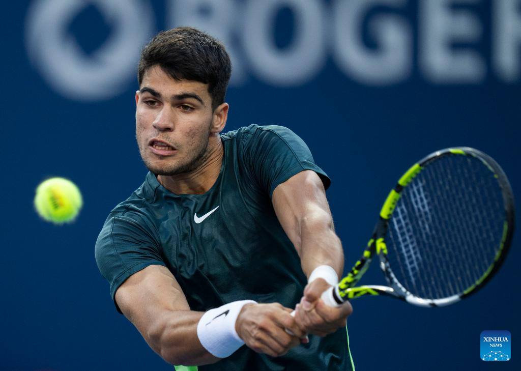 Carlos Alcaraz competes during the men's singles round of 16 match between Carlos Alcaraz of Spain and Hubert Hurkacz of Poland at the National Bank Open tennis tournament in Toronto, Canada, on Aug. 10, 2023. (Photo by Zou Zheng/Xinhua)