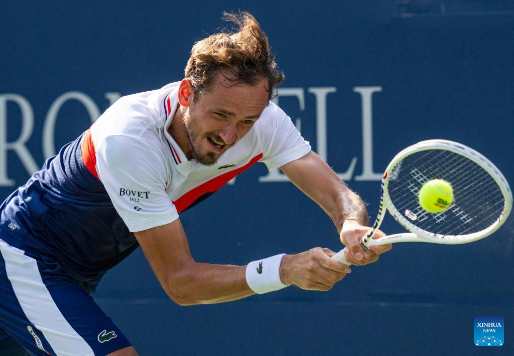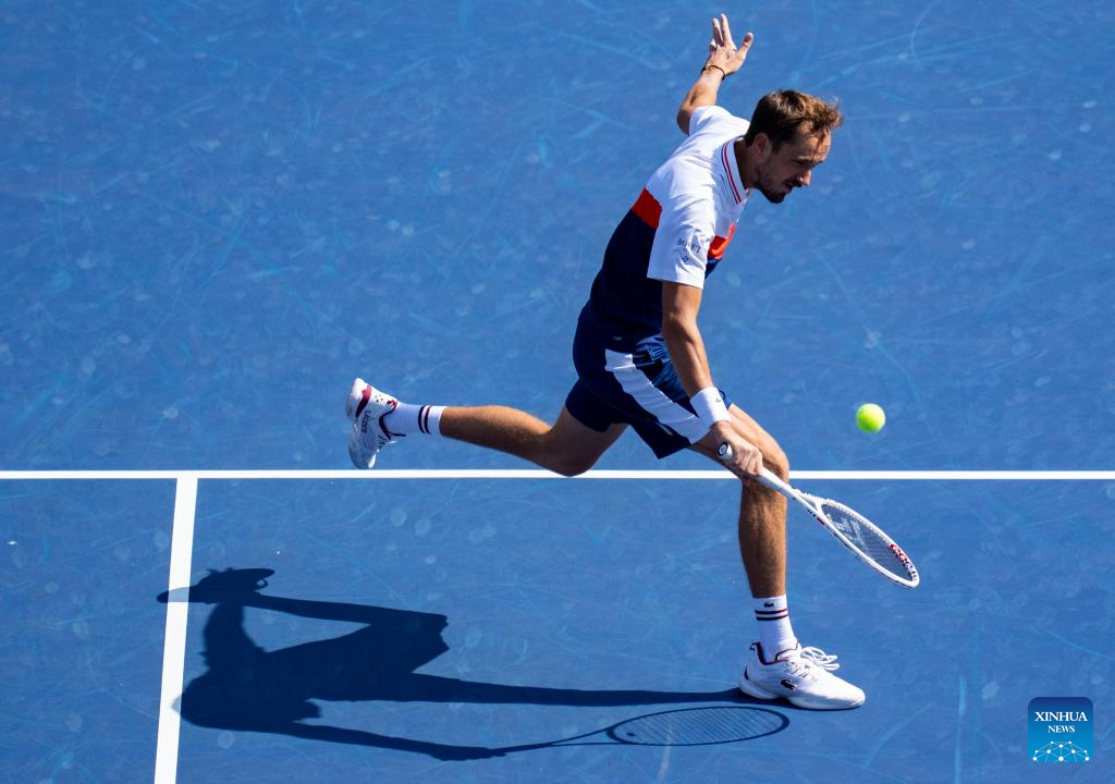 Daniil Medvedev competes during the men's singles round of 16 match between Lorenzo Musetti of Italy and Daniil Medvedev of Russia at the National Bank Open tennis tournament in Toronto, Canada, on Aug. 10, 2023. (Photo by Zou Zheng/Xinhua)
