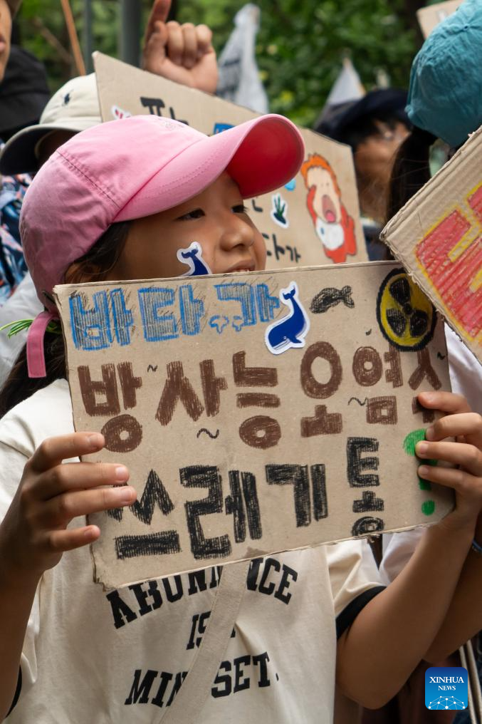 A child attends a rally to protest against the Japanese government's plan to discharge nuclear-contaminated wastewater into the sea in Seoul, South Korea, Aug. 12, 2023. (Photo by James Lee/Xinhua)