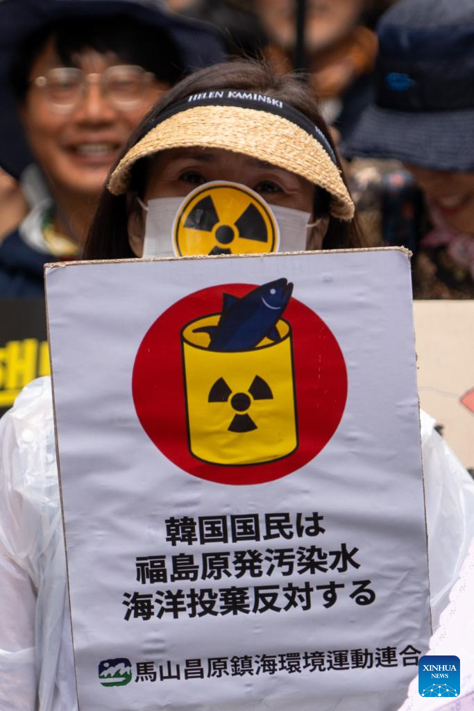 People attend a rally to protest against the Japanese government's plan to discharge nuclear-contaminated wastewater into the sea in Seoul, South Korea, Aug. 12, 2023. (Photo by James Lee/Xinhua)