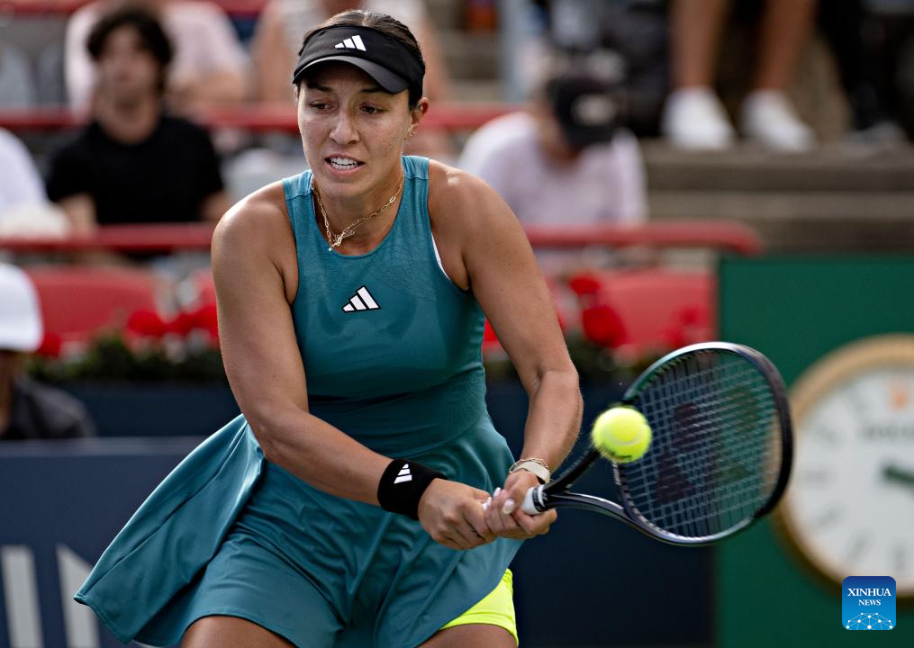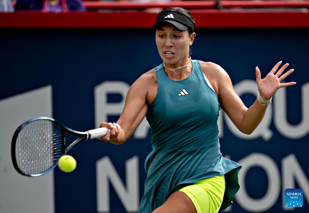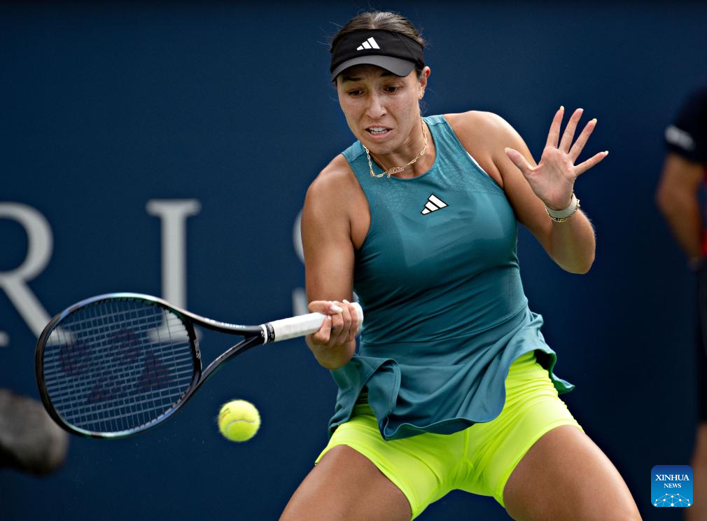 Jessica Pegula hits a return during the women's singles quarterfinal match between Jessica Pegula of the United States and Coco Gauff of the United States at the National Bank Open tennis tournament in Montreal, Canada, on Aug. 11, 2023. (Photo by Andrew Soong/Xinhua)