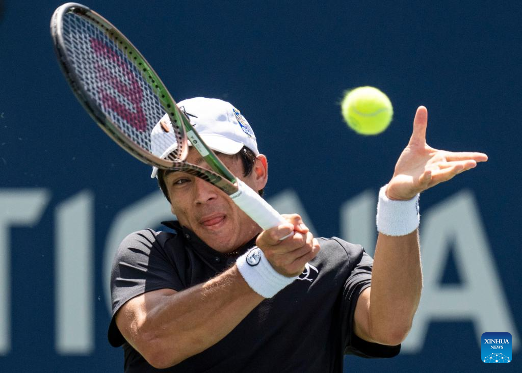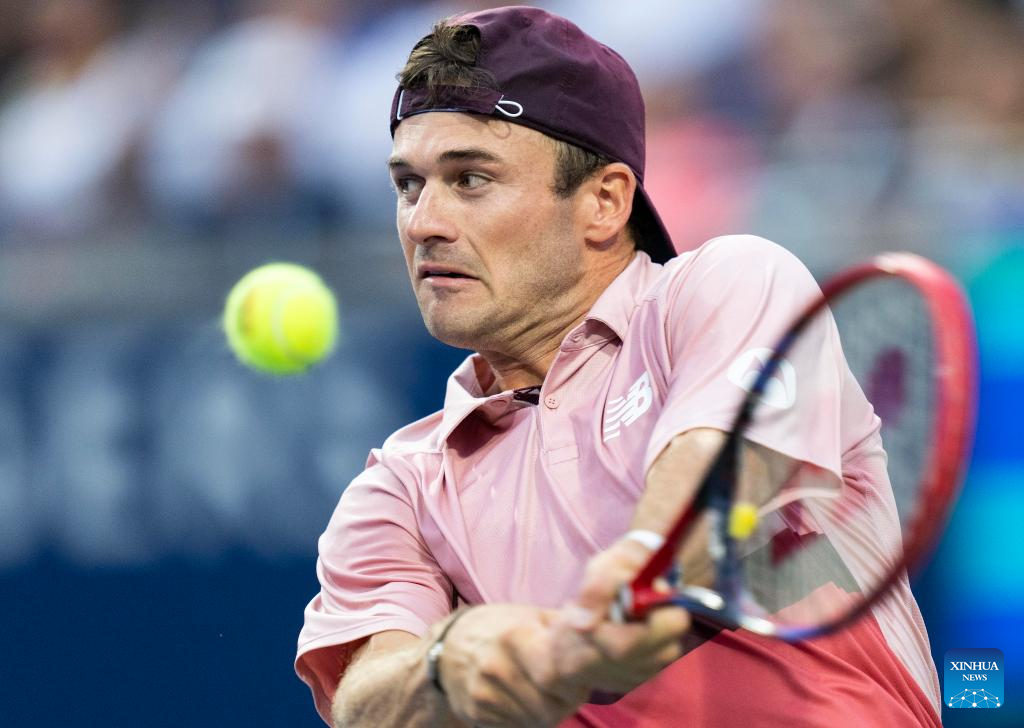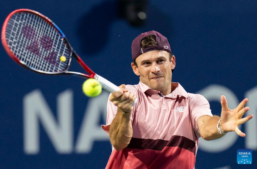 Mackenzie McDonald hits a return during the men's singles quarterfinal match between Alejandro Davidovich Fokina of Spain and Mackenzie McDonald of the United States at the National Bank Open tennis tournament in Toronto, Canada, Aug. 11, 2023. (Photo by Zou Zheng/Xinhua)
