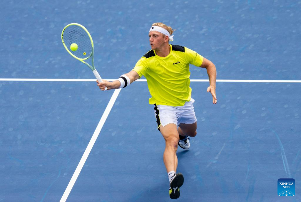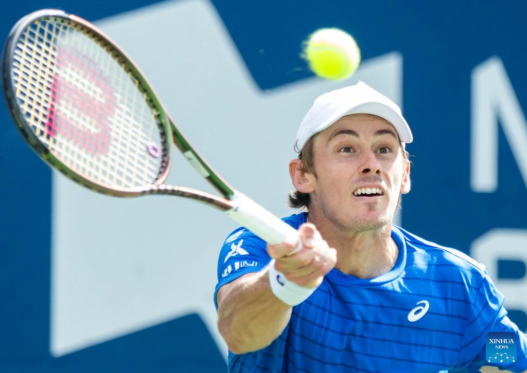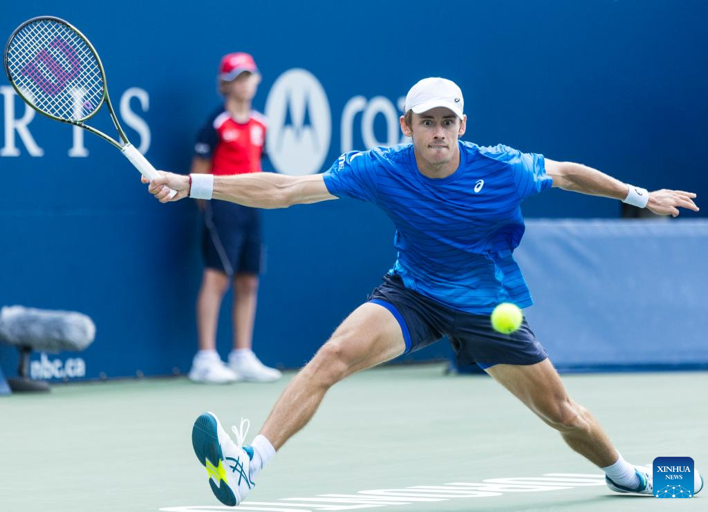 Alex De Minaur hits a return during the men's singles quarterfinal match between Daniil Medvedev of Russia and Alex De Minaur of Australia at the National Bank Open tennis tournament in Toronto, Canada, Aug. 11, 2023. (Photo by Zou Zheng/Xinhua)