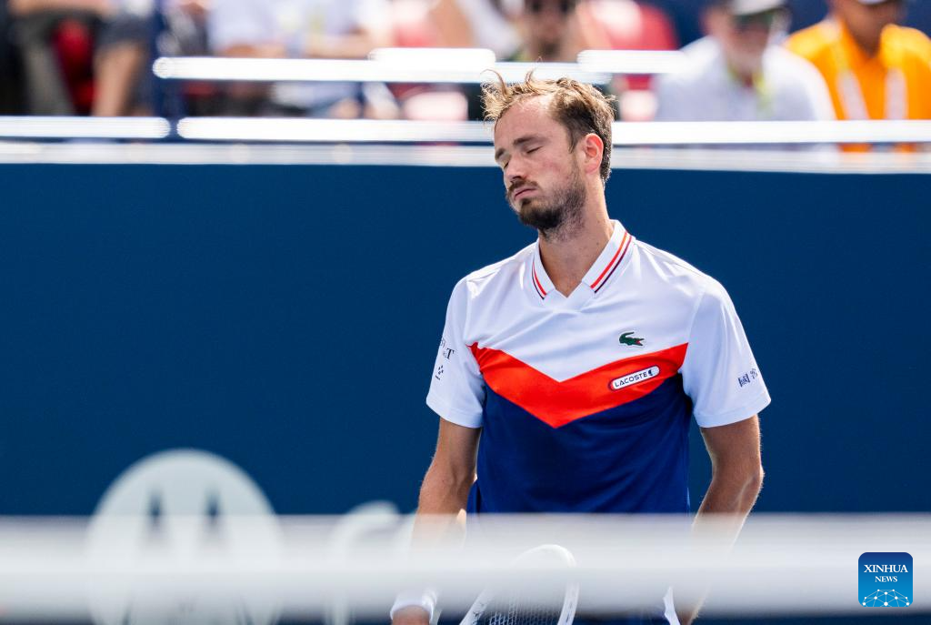 Daniil Medvedev reacts during the men's singles quarterfinal match between Daniil Medvedev of Russia and Alex De Minaur of Australia at the National Bank Open tennis tournament in Toronto, Canada, Aug. 11, 2023. (Photo by Zou Zheng/Xinhua)