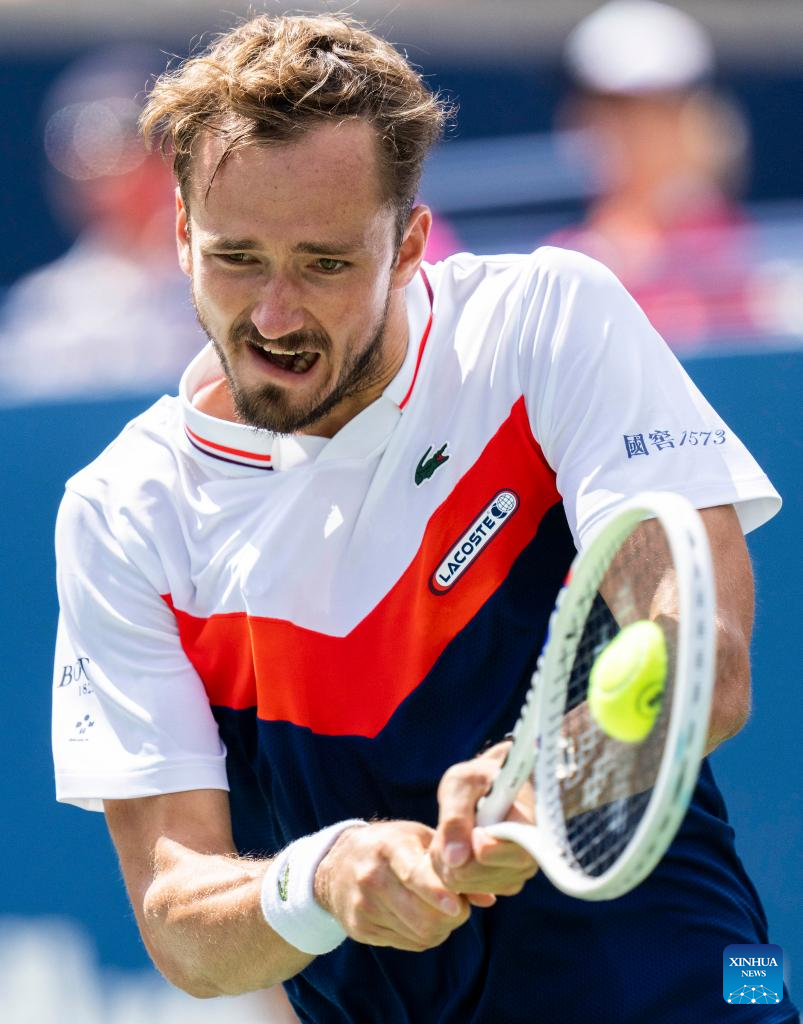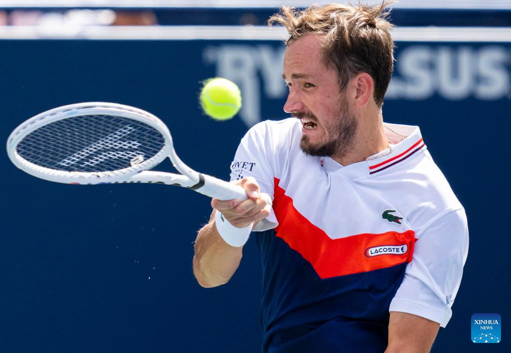 Daniil Medvedev hits a return during the men's singles quarterfinal match between Daniil Medvedev of Russia and Alex De Minaur of Australia at the National Bank Open tennis tournament in Toronto, Canada, Aug. 11, 2023. (Photo by Zou Zheng/Xinhua)