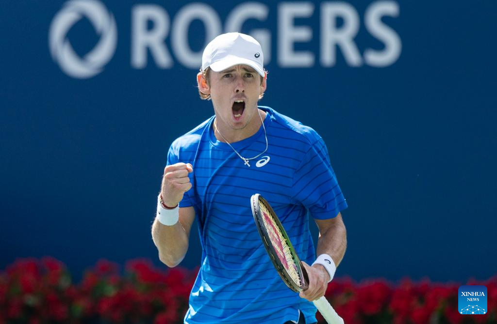 Alex De Minaur celebrates during the men's singles quarterfinal match between Daniil Medvedev of Russia and Alex De Minaur of Australia at the National Bank Open tennis tournament in Toronto, Canada, Aug. 11, 2023. (Photo by Zou Zheng/Xinhua)