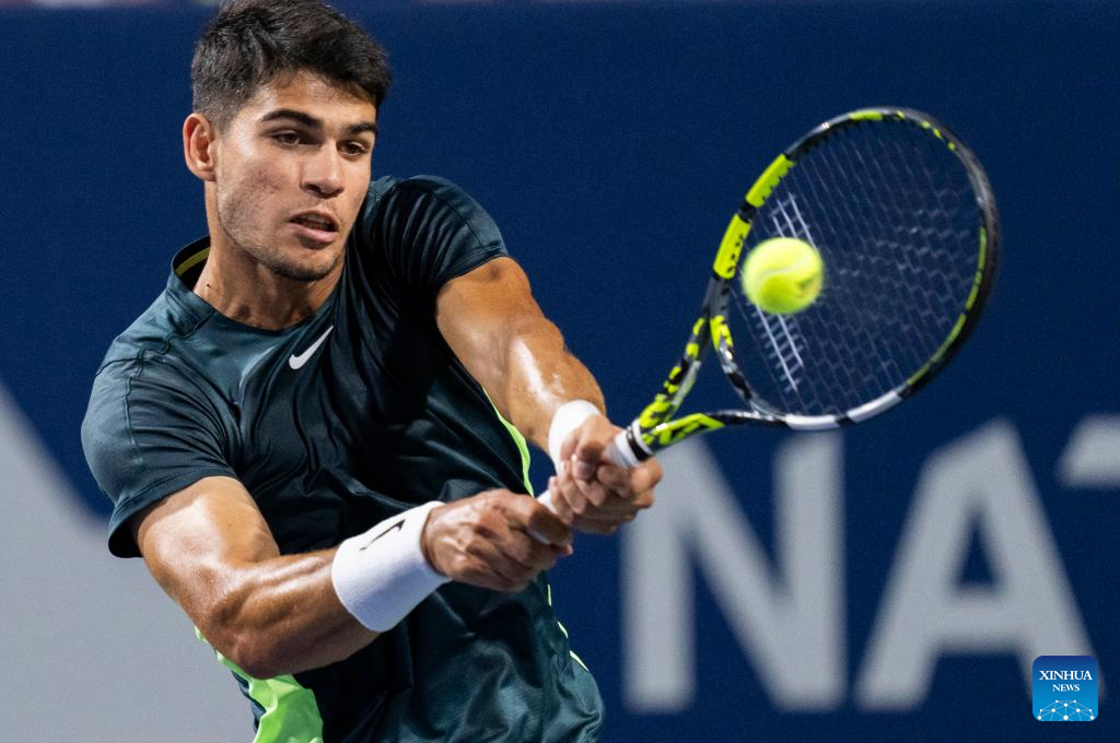 Carlos Alcaraz competes during the men's singles quarterfinal match between Carlos Alcaraz of Spain and Tommy Paul of the United States at the National Bank Open tennis tournament in Toronto, Canada, Aug. 11, 2023. (Photo by Zou Zheng/Xinhua)