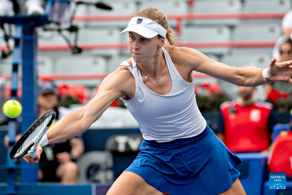 Liudmila Samsonova hits a return during the women's singles round of 16 match between Aryna Sabalenka of Belarus and Liudmila Samsonova of Russia at the National Bank Open tennis tournament in Montreal, Canada, on Aug. 11, 2023. (Photo by Andrew Soong/Xinhua)