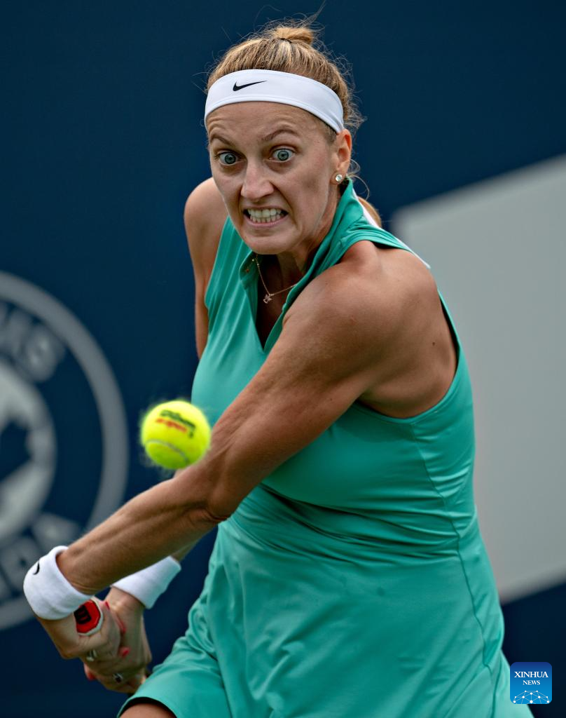 Petra Kvitova hits a return during the women's singles round of 16 match between Petra Kvitova of the Czech Republic and Belinda Bencic of Switzerland at the National Bank Open tennis tournament in Montreal, Canada, on Aug. 11, 2023. (Photo by Andrew Soong/Xinhua)