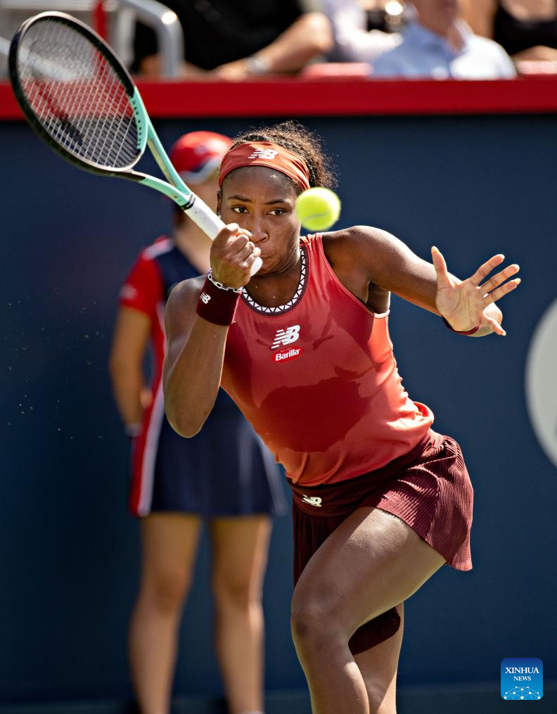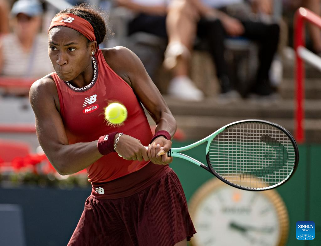 Coco Gauff hits a return during the women's singles quarterfinal match between Jessica Pegula of the United States and Coco Gauff of the United States at the National Bank Open tennis tournament in Montreal, Canada, on Aug. 11, 2023. (Photo by Andrew Soong/Xinhua)