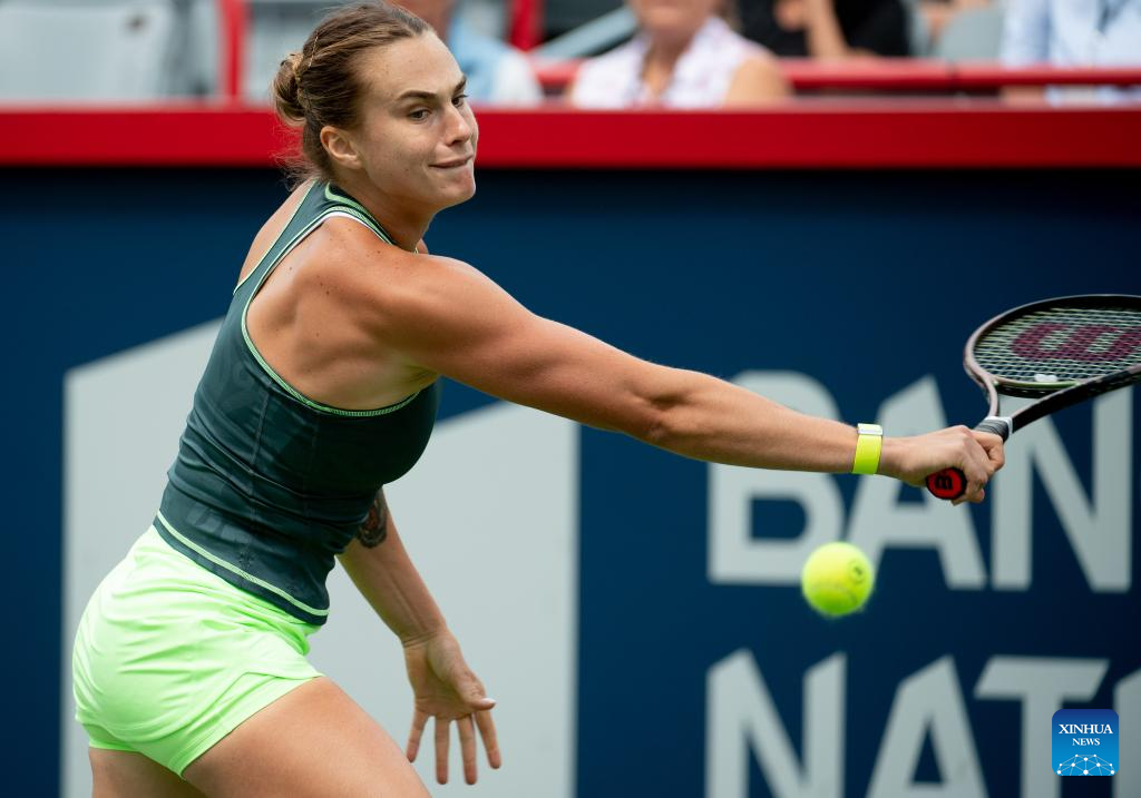 Aryna Sabalenka hits a return during the women's singles round of 16 match between Aryna Sabalenka of Belarus and Liudmila Samsonova of Russia at the National Bank Open tennis tournament in Montreal, Canada, on Aug. 11, 2023. (Photo by Andrew Soong/Xinhua)