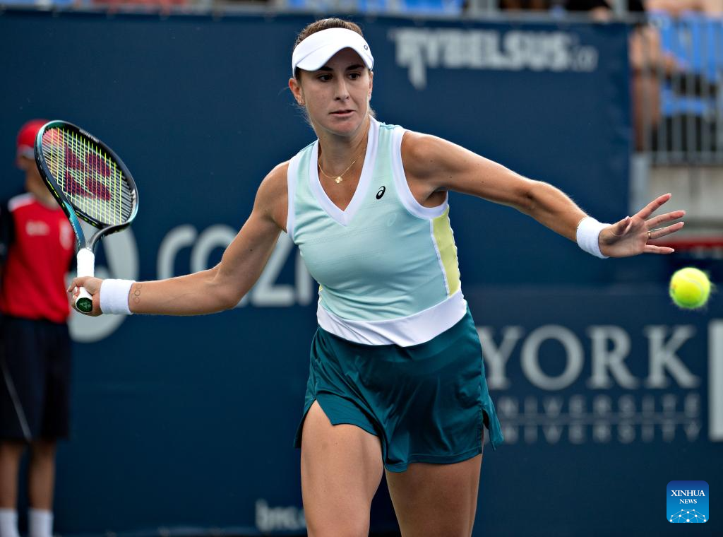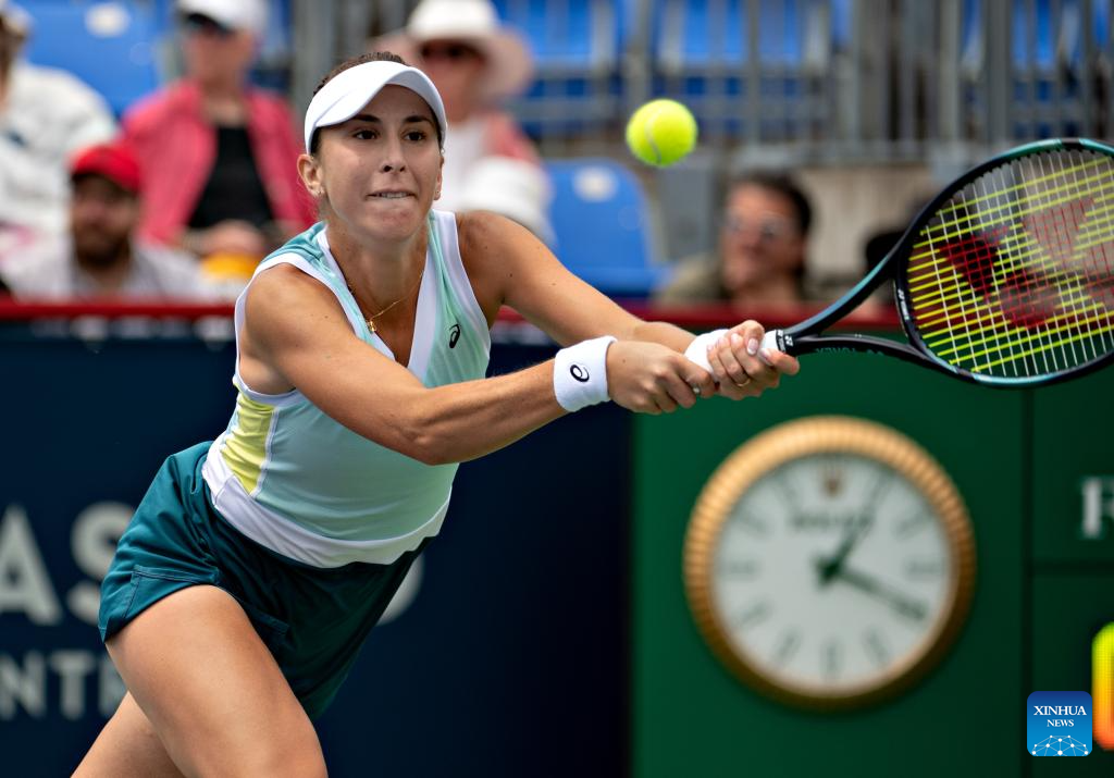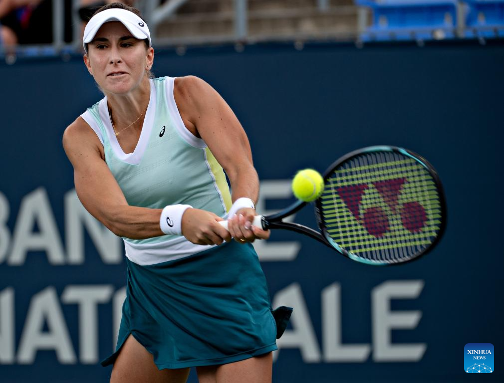 Belinda Bencic hits a return during the women's singles round of 16 match between Petra Kvitova of the Czech Republic and Belinda Bencic of Switzerland at the National Bank Open tennis tournament in Montreal, Canada, on Aug. 11, 2023. (Photo by Andrew Soong/Xinhua)