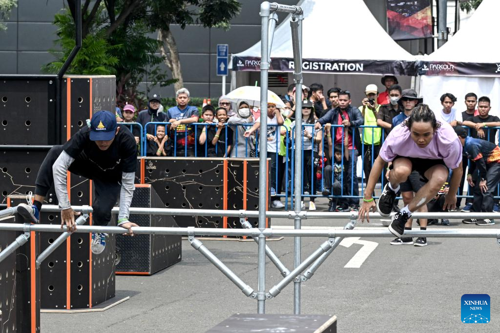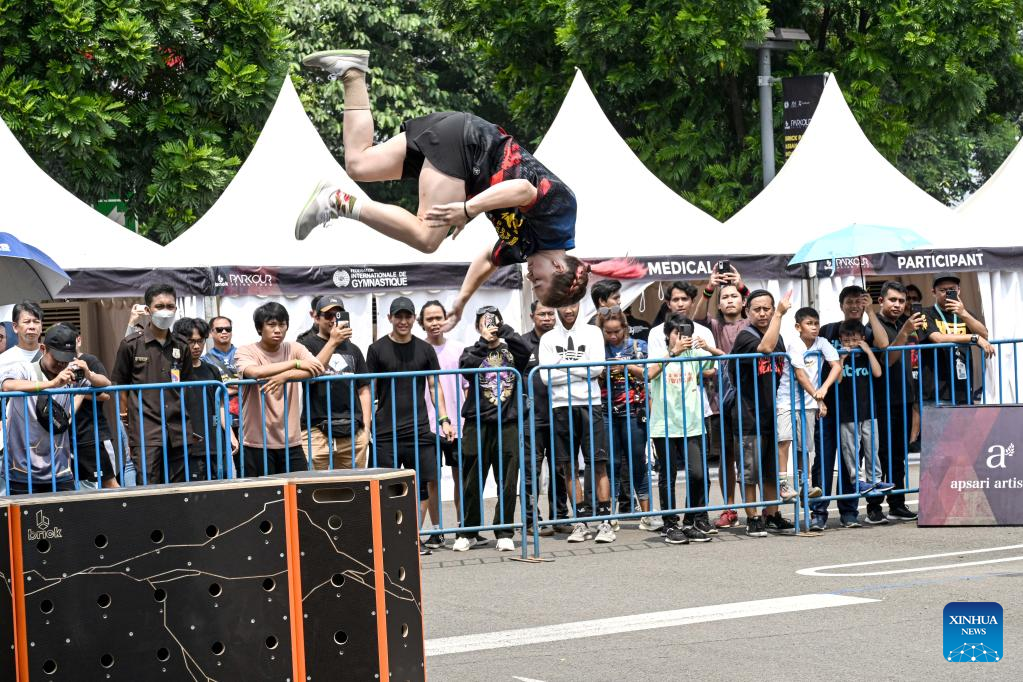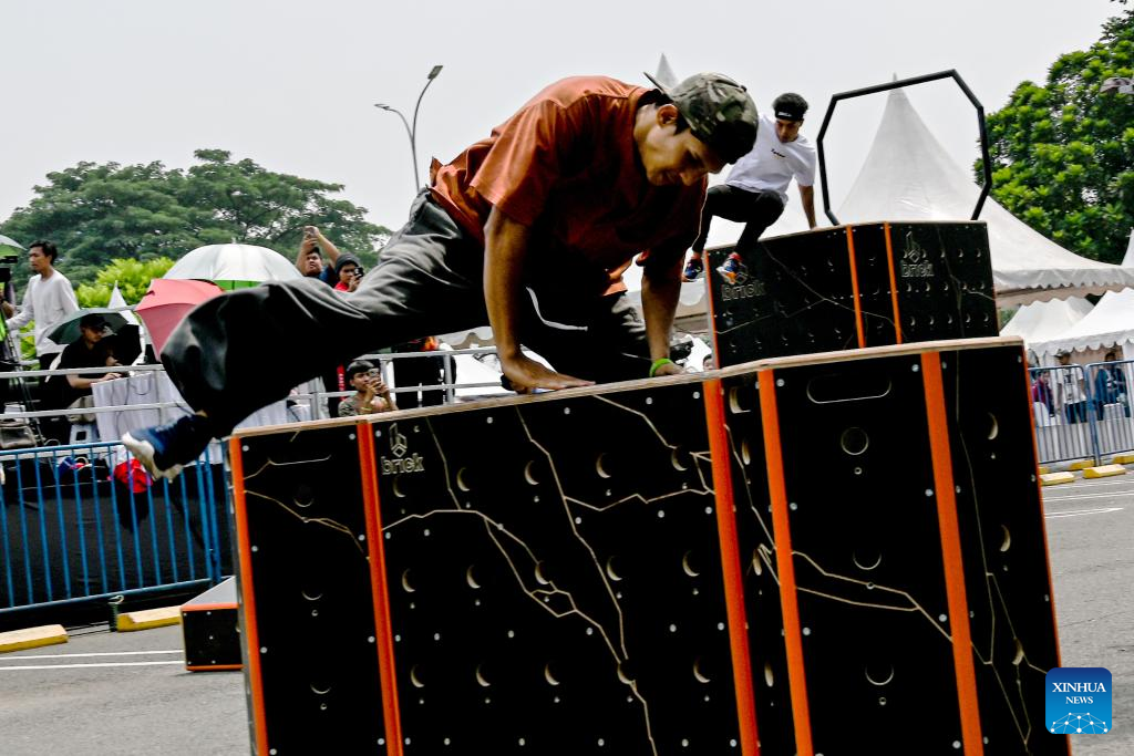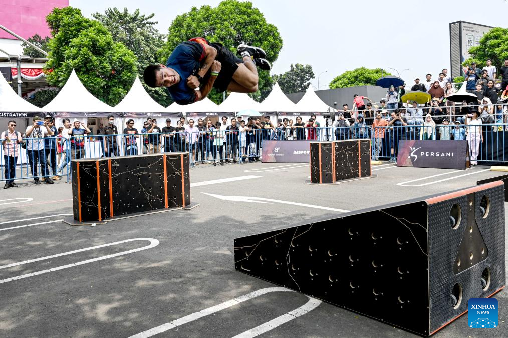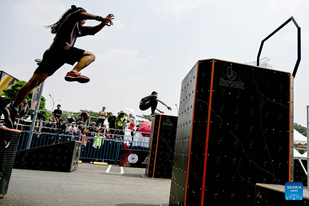 Mexican parkour athlete Javier Rodriguez Alvarez performs as opening show during the "Brick Parkour Asian Tour" in Tangerang, Banten Province, Indonesia, on Aug. 12, 2023. (Xinhua/Agung Kuncahya B.)