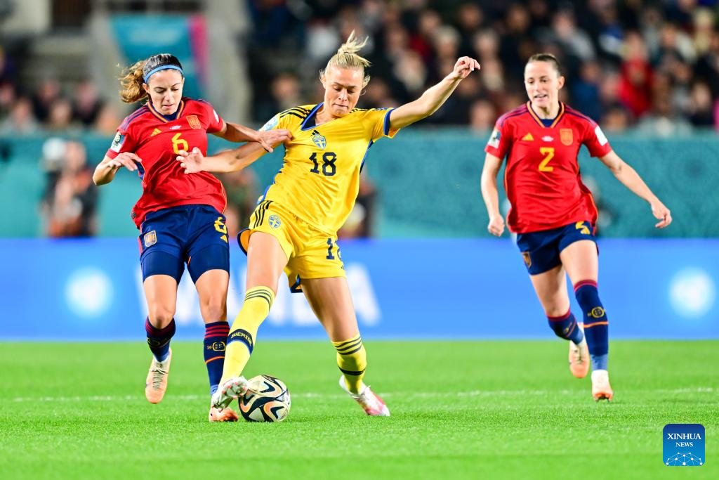 Aitana Bonmati (L) of Spain vies with Fridolina Rolfo (C) of Sweden during the semi-final match between Spain and Sweden at the FIFA Women's World Cup Australia & New Zealand 2023 in Auckland, New Zealand, Aug. 15, 2023. (Xinhua/Zhu Wei)