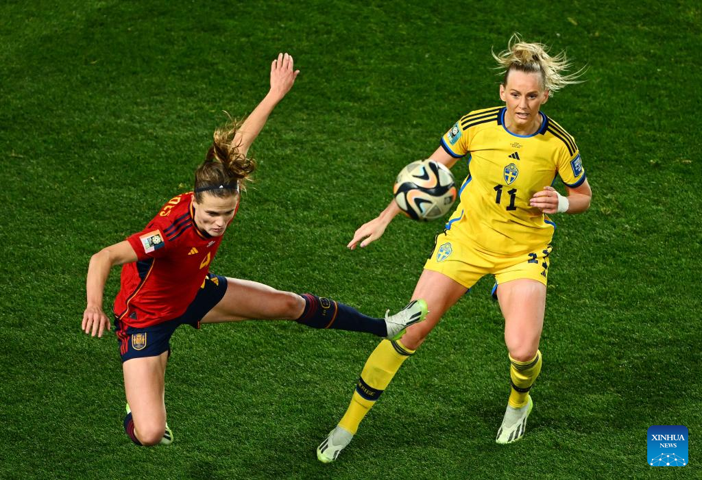 Alexia Putellas (L) of Spain vies with Filippa Angeldal of Sweden during the semi-final match between Spain and Sweden at the FIFA Women's World Cup Australia & New Zealand 2023 in Auckland, New Zealand, Aug. 15, 2023. (Xinhua/Zhu Wei)