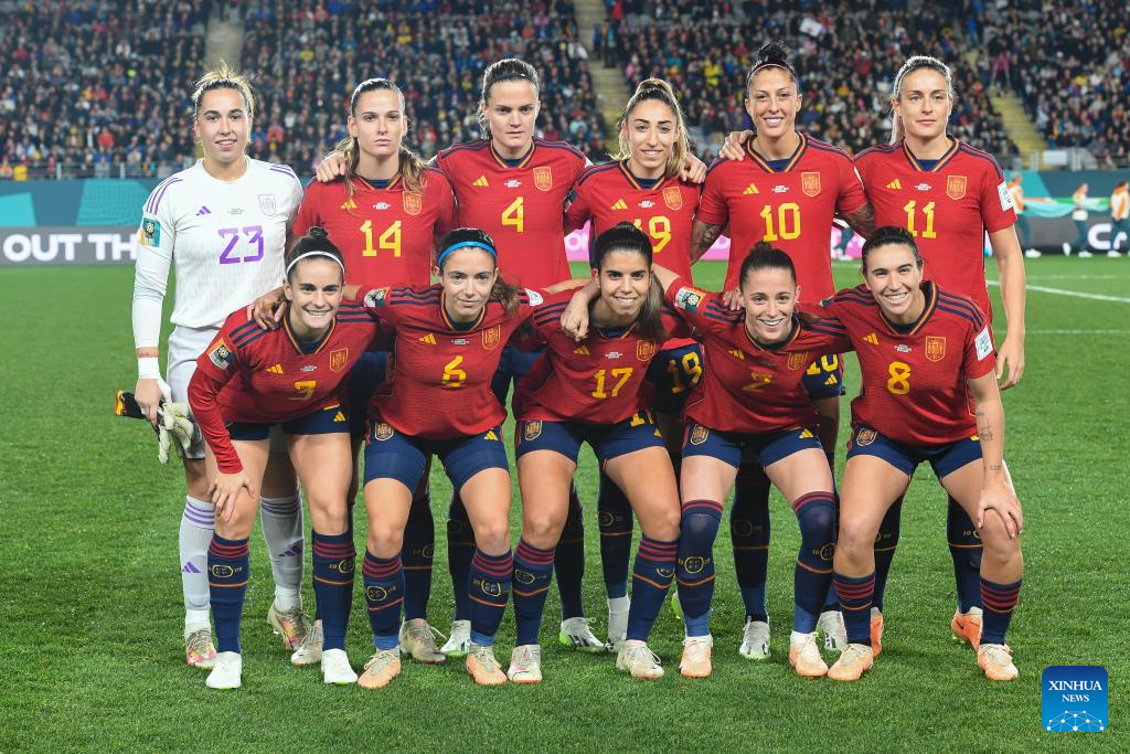 Players of Spain take a group photo before the semi-final match between Spain and Sweden at the FIFA Women's World Cup Australia & New Zealand 2023 in Auckland, New Zealand, Aug. 15, 2023. (Xinhua/Guo Lei)