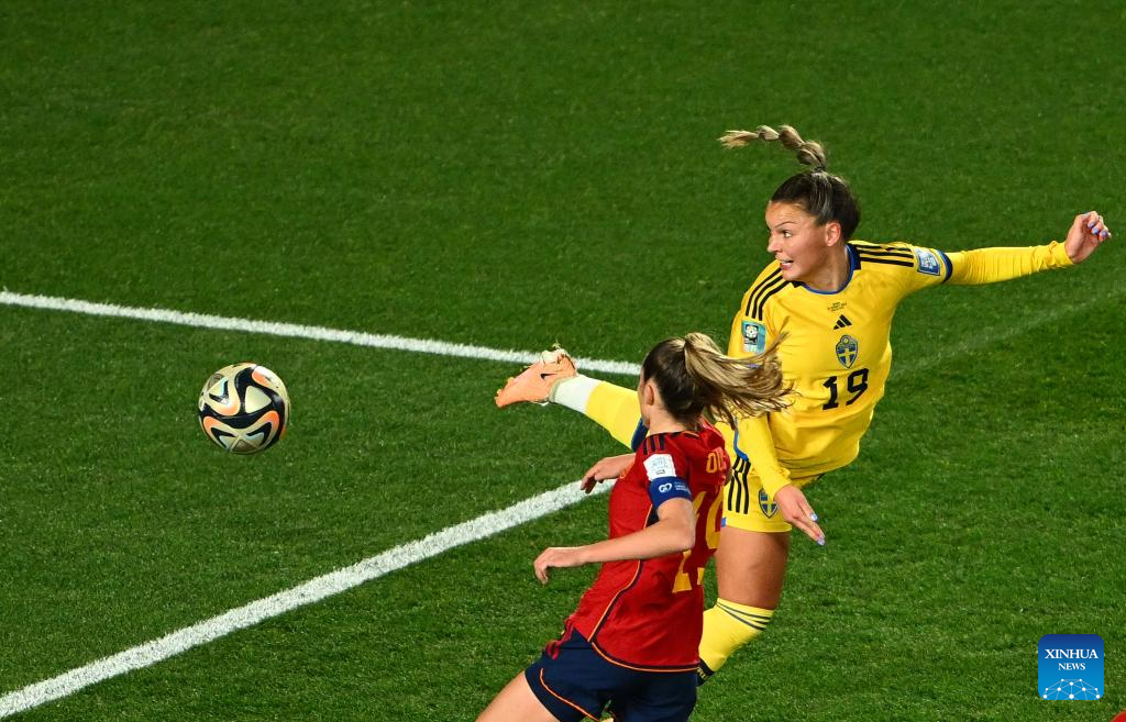 Johanna Kaneryd (R) of Sweden competes during the semi-final match between Spain and Sweden at the FIFA Women's World Cup Australia & New Zealand 2023 in Auckland, New Zealand, Aug. 15, 2023. (Xinhua/Li Yibo)