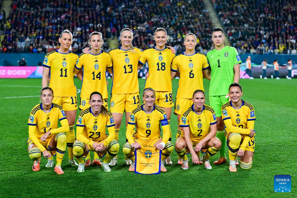 Players of Sweden take a group photo before the semi-final match between Spain and Sweden at the FIFA Women's World Cup Australia & New Zealand 2023 in Auckland, New Zealand, Aug. 15, 2023. (Xinhua/Zhu Wei)