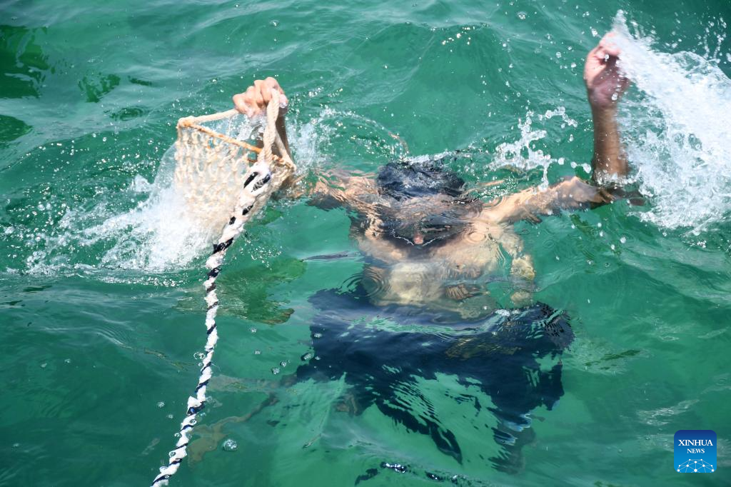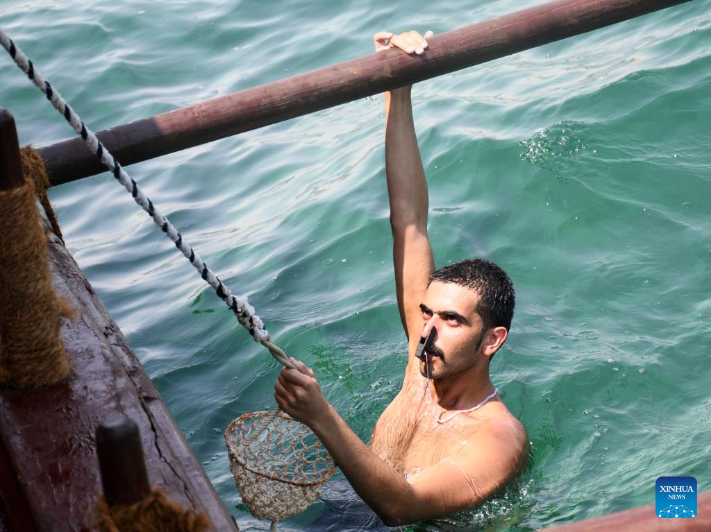 A diver looks for pearls during the 32nd Pearl Diving Festival in Ahmadi Governorate, Kuwait, Aug. 15, 2023. Up to 60 young divers take part in the festival. Usually, divers need to go about 10 meters from the surface by free-diving, meaning without the use of breathing equipment, and search for pearls from wild shells. (Photo by Asad/Xinhua)