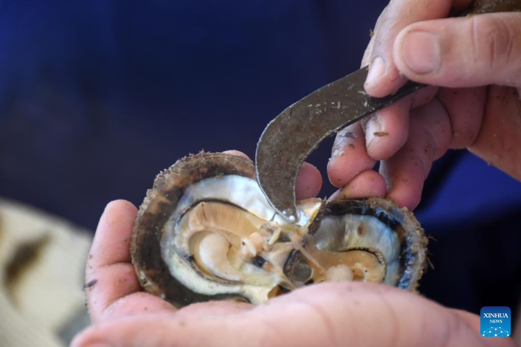 A man looks for pearls from an oyster during the 32nd Pearl Diving Festival in Ahmadi Governorate, Kuwait, Aug. 15, 2023. Up to 60 young divers take part in the festival. Usually, divers need to go about 10 meters from the surface by free-diving, meaning without the use of breathing equipment, and search for pearls from wild shells. (Photo by Asad/Xinhua)