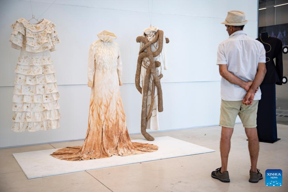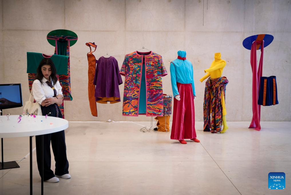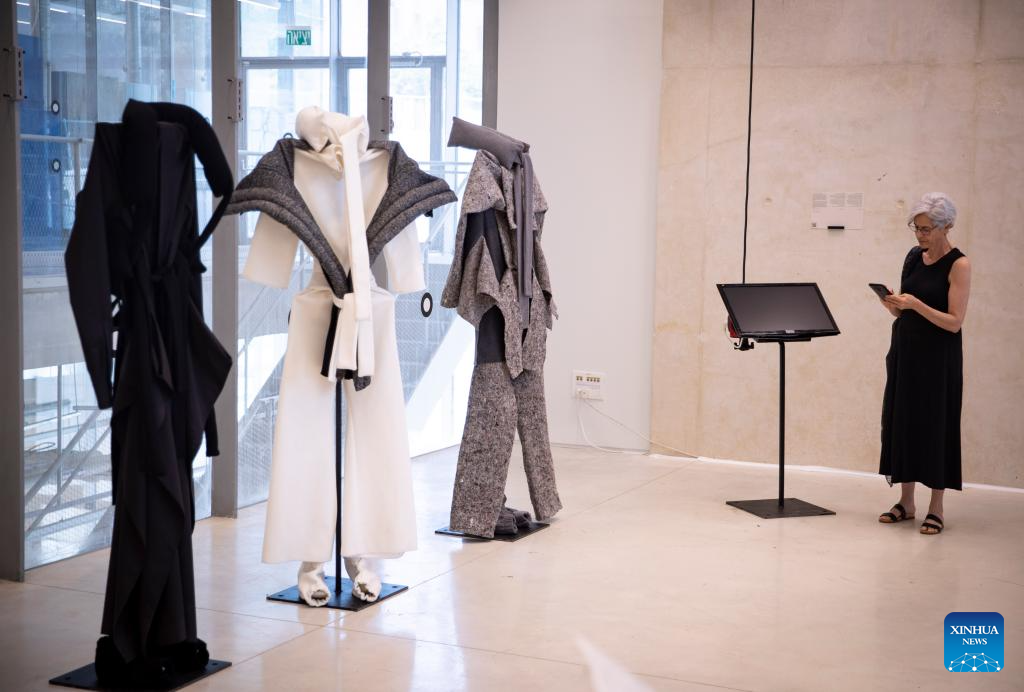 This photo taken on Aug. 15, 2023 shows clothing design works during the Graduate Exhibition at Bezalel Academy of Arts and Design in Jerusalem. More than 400 graduates from all the Bezalel's departments have presented their works in places which are transformed from study areas into a giant museum for a two-week period. (Xinhua/Chen Junqing)