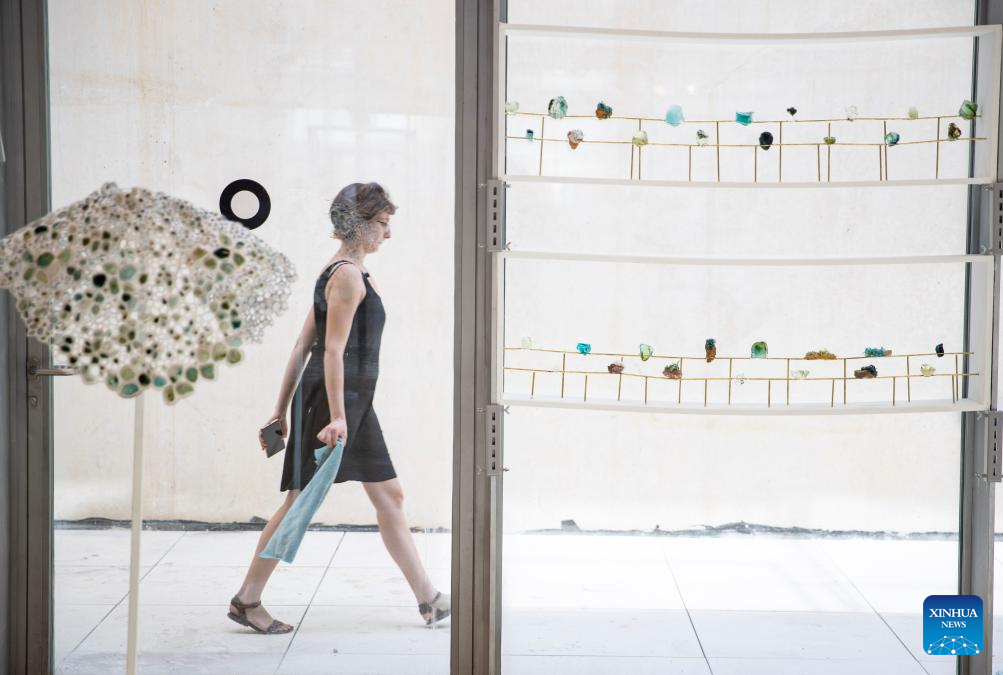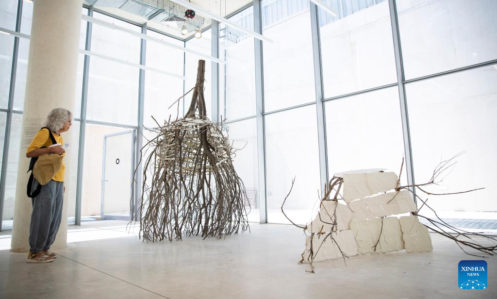 A woman visits the Graduate Exhibition at Bezalel Academy of Arts and Design in Jerusalem on Aug. 15, 2023. More than 400 graduates from all the Bezalel's departments have presented their works in places which are transformed from study areas into a giant museum for a two-week period. (Xinhua/Chen Junqing)