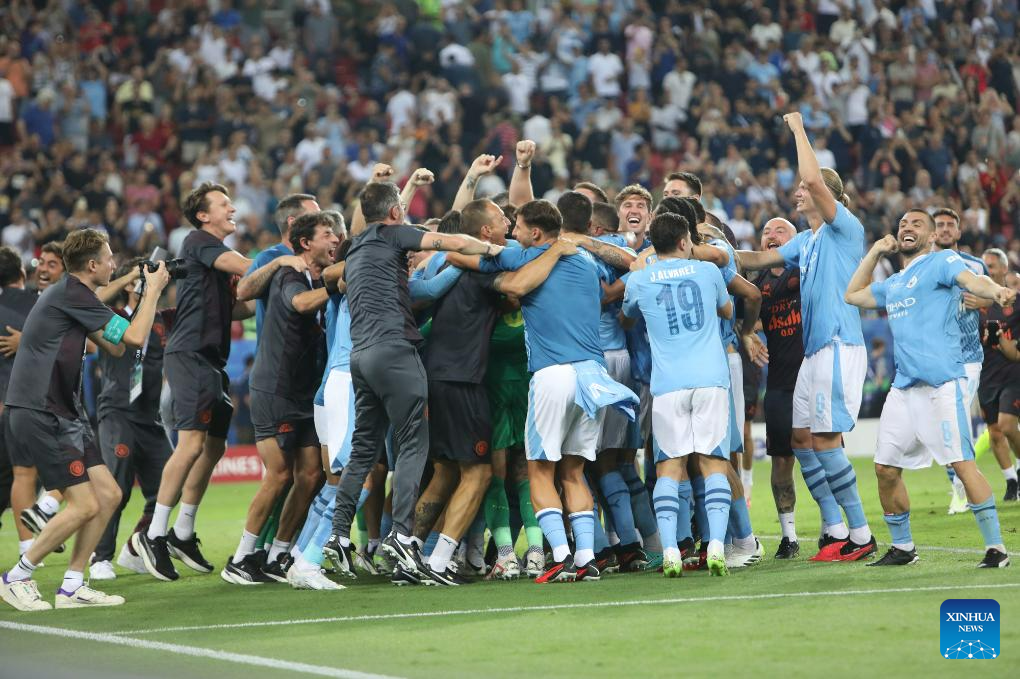 Players of Manchester City celebrate after the 2023 UEFA Super Cup football match between Manchester City and Sevilla in Piraeus, Greece, on Aug. 16, 2023. (Photo by Panagiotis Moschandreou/Xinhua)