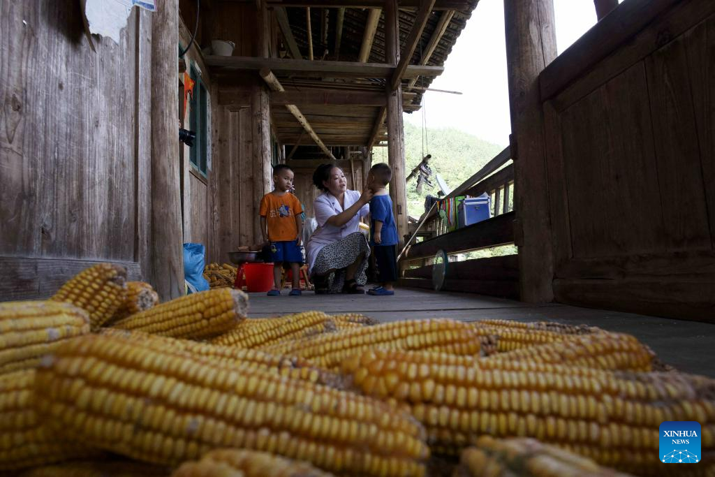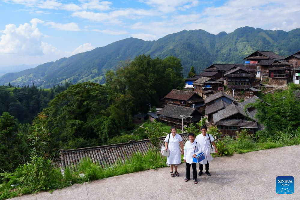 Xiang Changhui checks on a child during a home visit in Panchi Village of Rongjiang County, Qiandongnan Miao and Dong Autonomous Prefecture, southwest China's Guizhou Province, Aug. 16, 2023. Wu Changxi, his son Wu Tao and his daughter-in-law Xiang Changhui are all rural doctors, working in three villages respectively, taking care of the health of more than 820 households and 3,660 people. (Xinhua/Liu Xu)