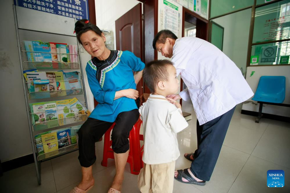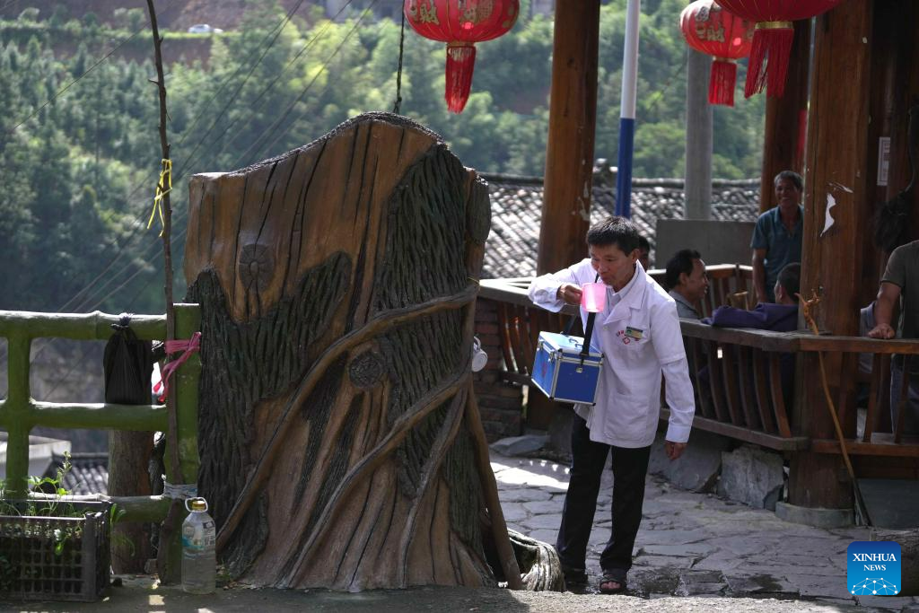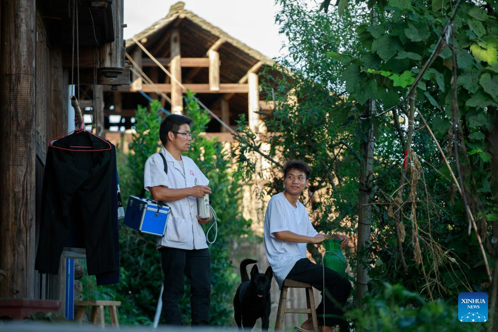 Wu Tao checks on a villager in Zendiu Village of Rongjiang County, Qiandongnan Miao and Dong Autonomous Prefecture, southwest China's Guizhou Province, Aug. 16, 2023. Wu Changxi, his son Wu Tao and his daughter-in-law Xiang Changhui are all rural doctors, working in three villages respectively, taking care of the health of more than 820 households and 3,660 people. (Xinhua/Liu Xu)