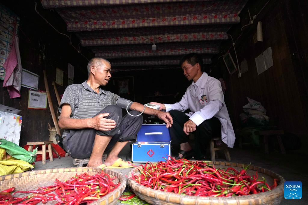 Wu Changxi measures the blood pressure for a villager during a home visit in Dingnong Village of Rongjiang County, Qiandongnan Miao and Dong Autonomous Prefecture, southwest China's Guizhou Province, Aug. 16, 2023. Wu Changxi, his son Wu Tao and his daughter-in-law Xiang Changhui are all rural doctors, working in three villages respectively, taking care of the health of more than 820 households and 3,660 people. (Xinhua/Liu Xu)