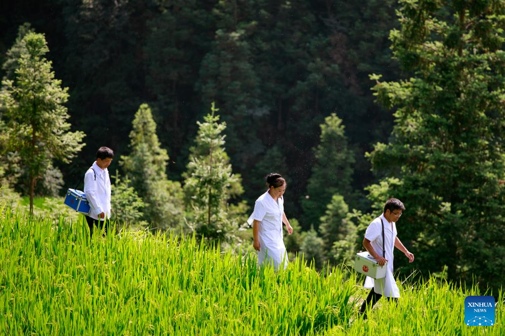 Wu Changxi (L), Wu Tao (R), and Xiang Changhui walk in a field on the outskirts of Dingnong Village of Rongjiang County, Qiandongnan Miao and Dong Autonomous Prefecture, southwest China's Guizhou Province, Aug. 16, 2023. Wu Changxi, his son Wu Tao and his daughter-in-law Xiang Changhui are all rural doctors, working in three villages respectively, taking care of the health of more than 820 households and 3,660 people. (Xinhua/Liu Xu)