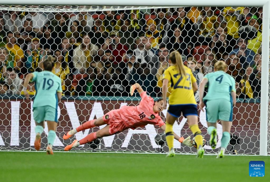Australia's goalkeeper Mackenzie Arnold (2nd L) fails to save the penalty kick by Sweden's Fridolina Rolfo during the third place play-off between Sweden and Australia at the 2023 FIFA Women's World Cup in Brisbane, Australia, Aug. 19, 2023. (Xinhua/Li Yibo)