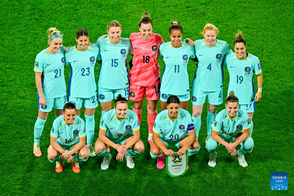 Players of Australia pose for photos before the third place play-off between Sweden and Australia at the 2023 FIFA Women's World Cup in Brisbane, Australia, Aug. 19, 2023. (Xinhua/Zhu Wei)