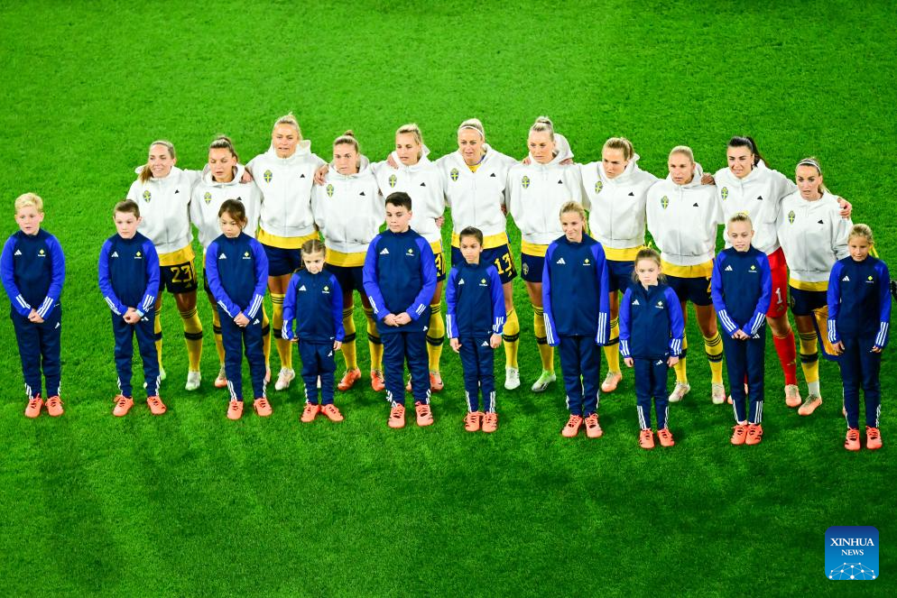 Players of Sweden stand for the national anthem before the third place play-off between Sweden and Australia at the 2023 FIFA Women's World Cup in Brisbane, Australia, Aug. 19, 2023. (Xinhua/Zhu Wei)