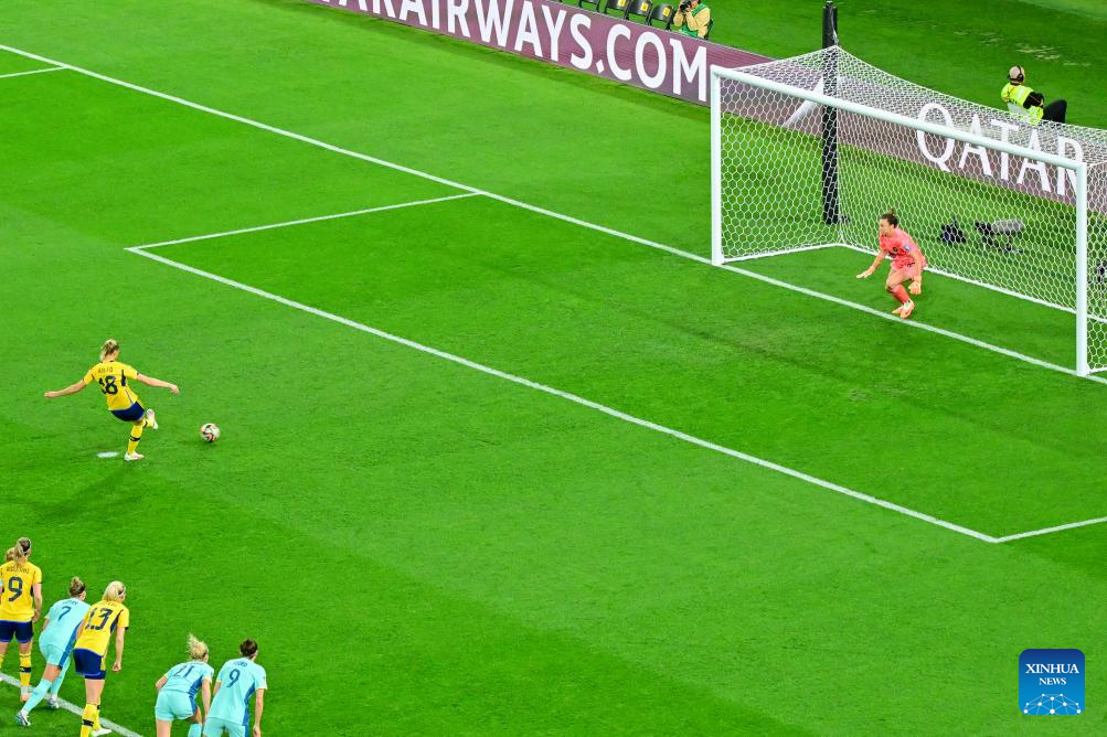 Sweden's Fridolina Rolfo (L) shoots a penalty kick during the third place play-off between Sweden and Australia at the 2023 FIFA Women's World Cup in Brisbane, Australia, Aug. 19, 2023. (Xinhua/Zhu Wei)