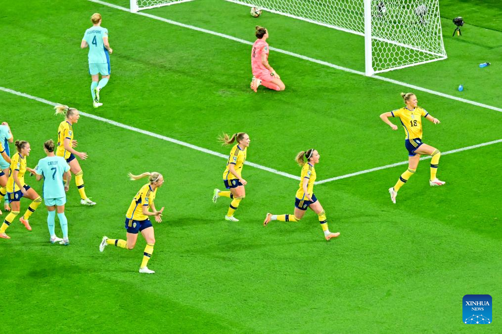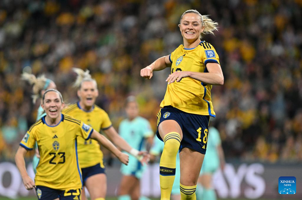 Sweden's Fridolina Rolfo (1st R) celebrates scoring a penalty kick during the third place play-off between Sweden and Australia at the 2023 FIFA Women's World Cup in Brisbane, Australia, Aug. 19, 2023. (Xinhua/Zhu Wei)