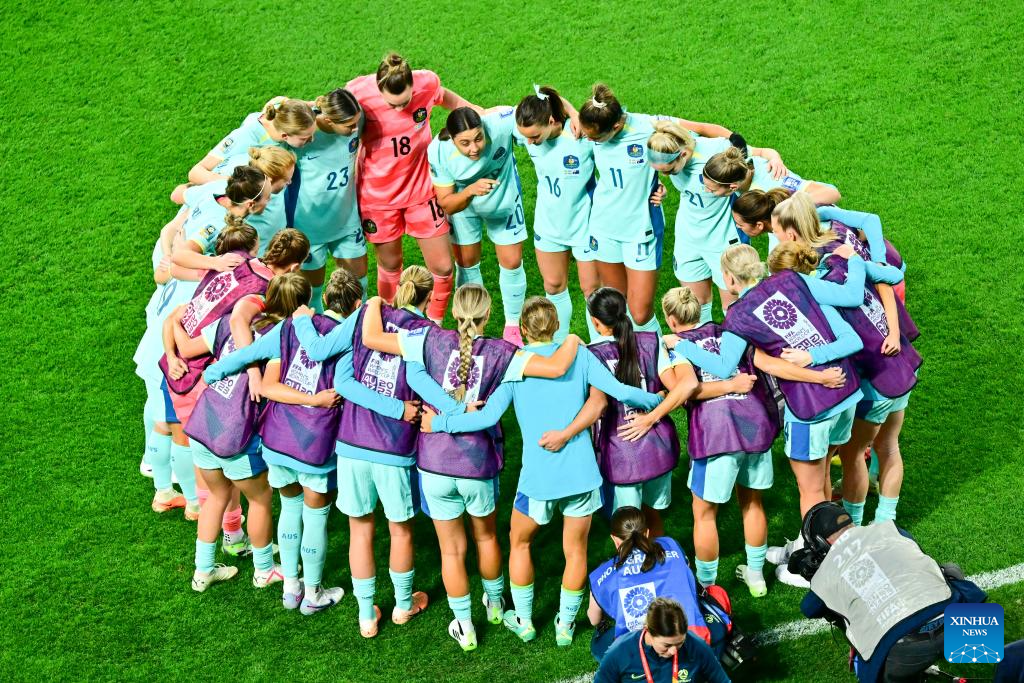 Players of Australia cheer before the third place play-off between Sweden and Australia at the 2023 FIFA Women's World Cup in Brisbane, Australia, Aug. 19, 2023. (Xinhua/Zhu Wei)