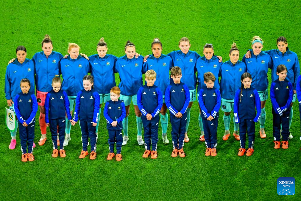 Players of Australia stand for the national anthem before the third place play-off between Sweden and Australia at the 2023 FIFA Women's World Cup in Brisbane, Australia, Aug. 19, 2023. (Xinhua/Zhu Wei)