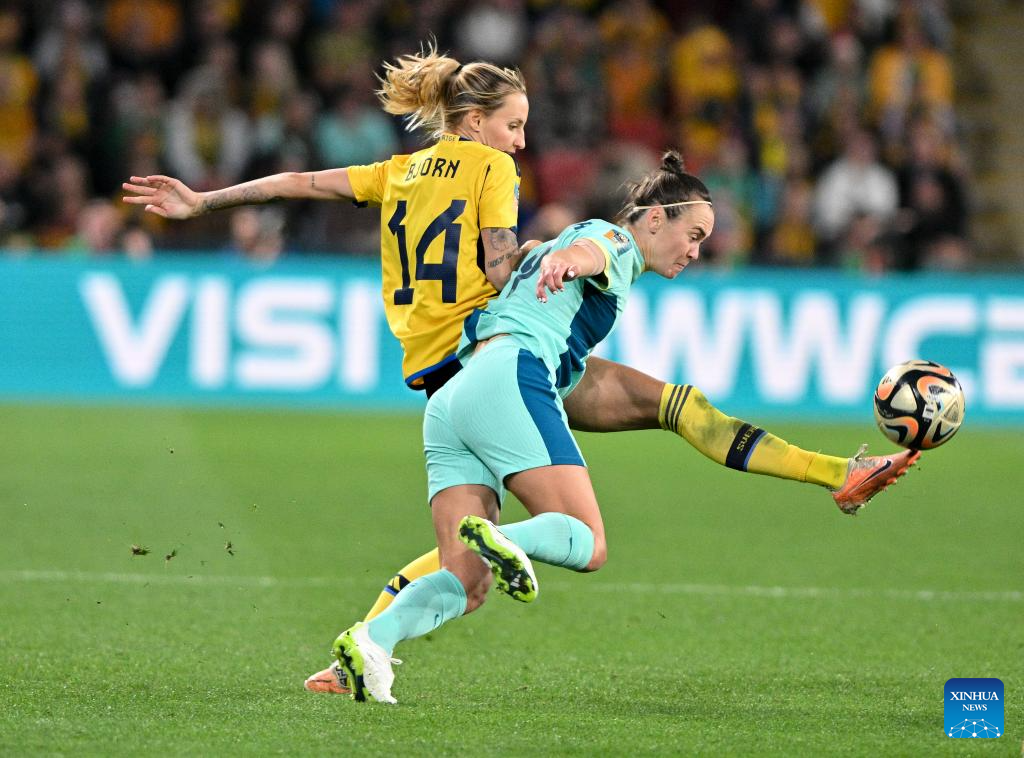 Sweden's Nathalie Bjorn (L) vies with Australia's Caitlin Foord during the third place play-off between Sweden and Australia at the 2023 FIFA Women's World Cup in Brisbane, Australia, Aug. 19, 2023. (Xinhua/Guo Lei)